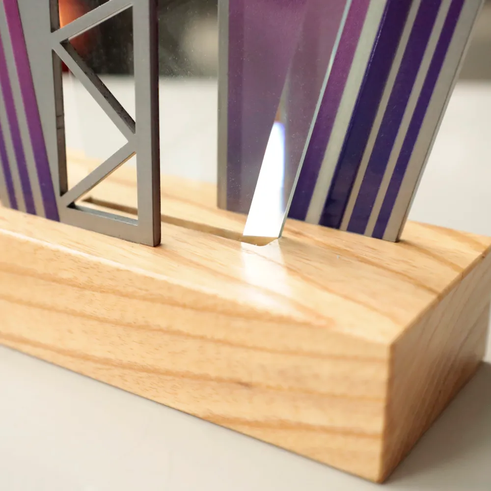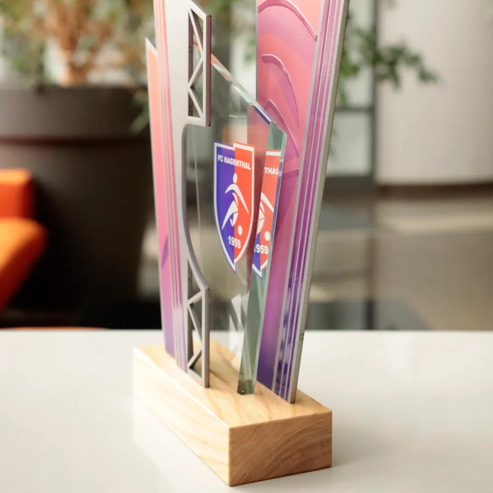 Trofej s dynamickým tvarem, která spojuje eleganci skla, kovu a přirozené teplo dřeva. Geometrický tvar podtrhuje sportovní charakter ocenění, zatímco vícevrstvá konstrukce mu dodává hloubku a prestiž.
