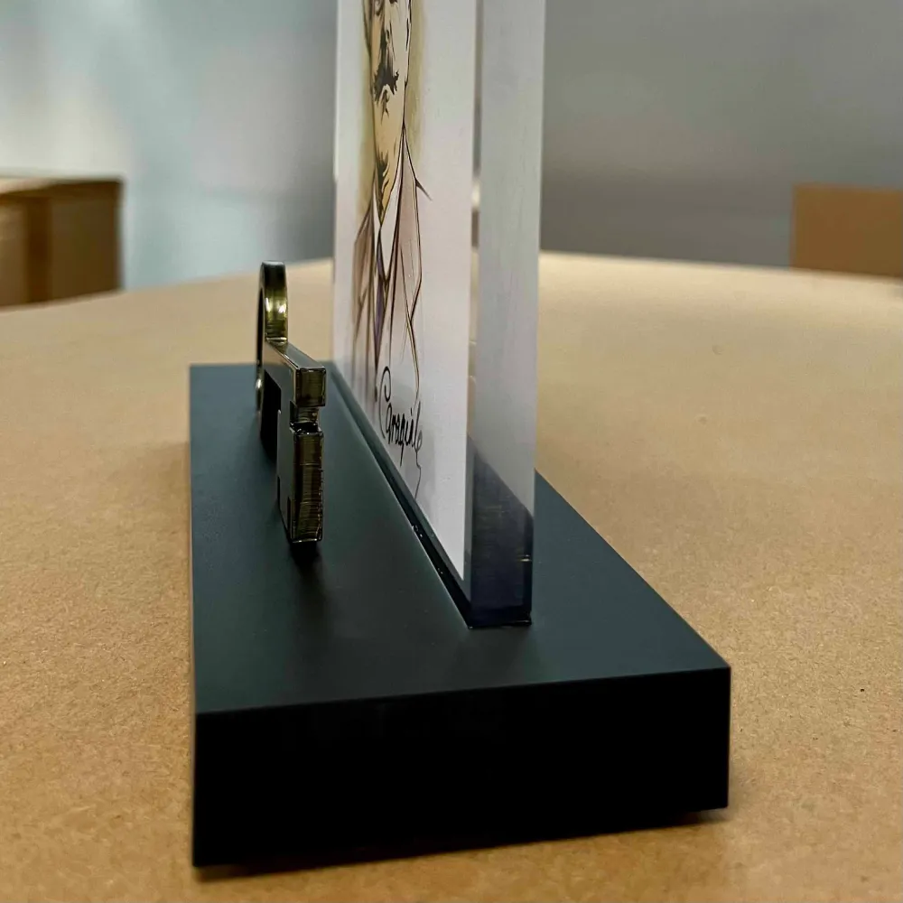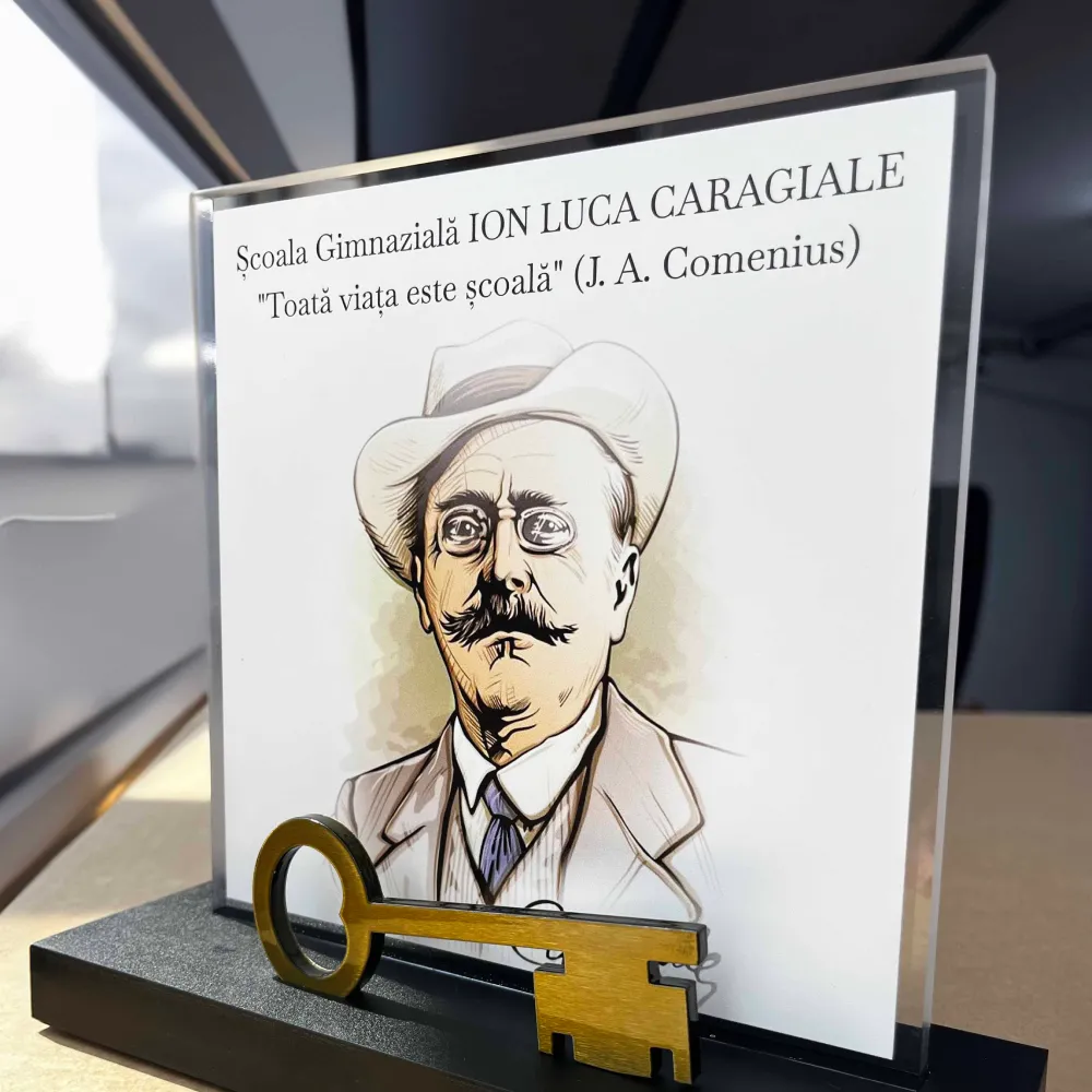 Ústředním prvkem je ilustrace Iona Lucy Caragialeho, významného rumunského spisovatele a dramatika, umístěná na akrylátovém panelu. Na dřevěné základně je připevněn stylizovaný zlatý klíč, který symbolizuje znalosti a vzdělání.