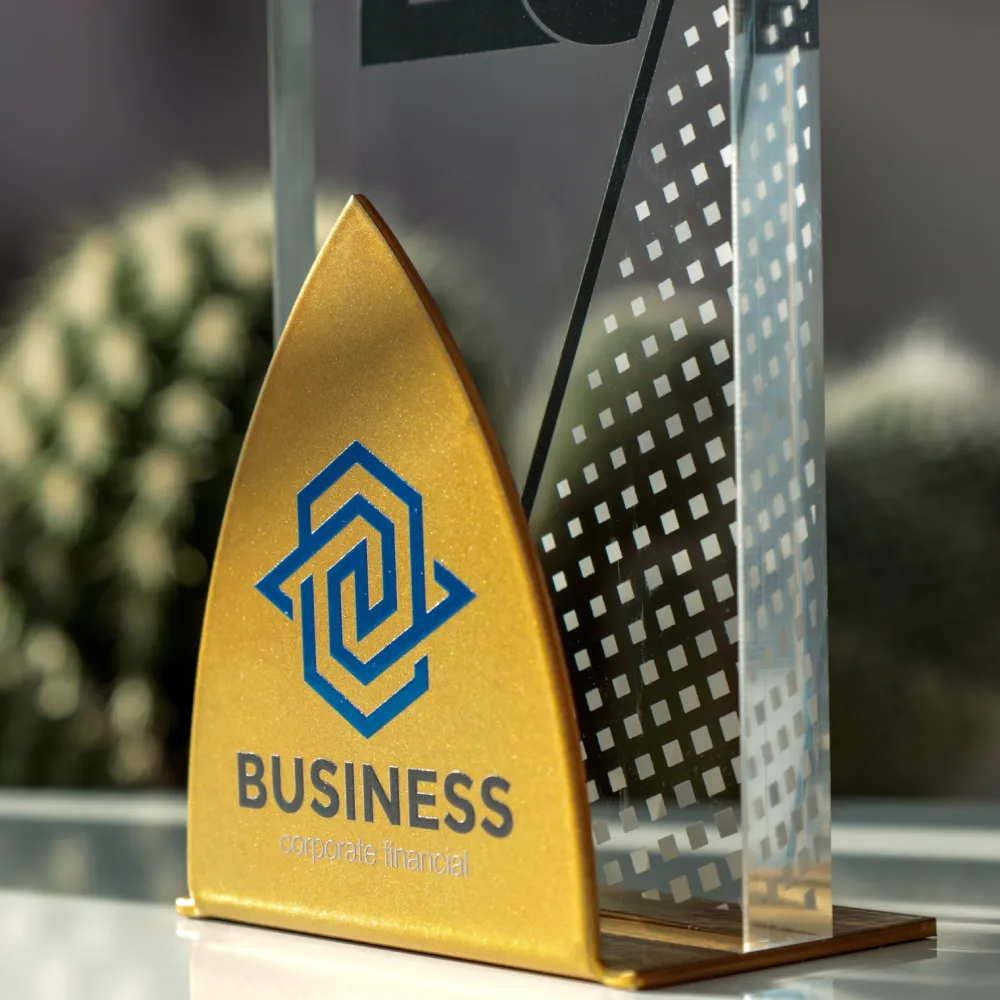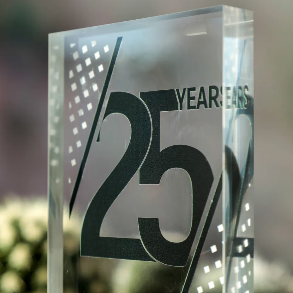 Moderní jubilejní soška k připomínce 25 let úspěšné činnosti. Transparentní akryl s elegantním potiskem a zlatý podstavec jí dodávají mimořádně prestižní charakter. Ideální ocenění pro firmy a organizace, které slaví své úspěchy.