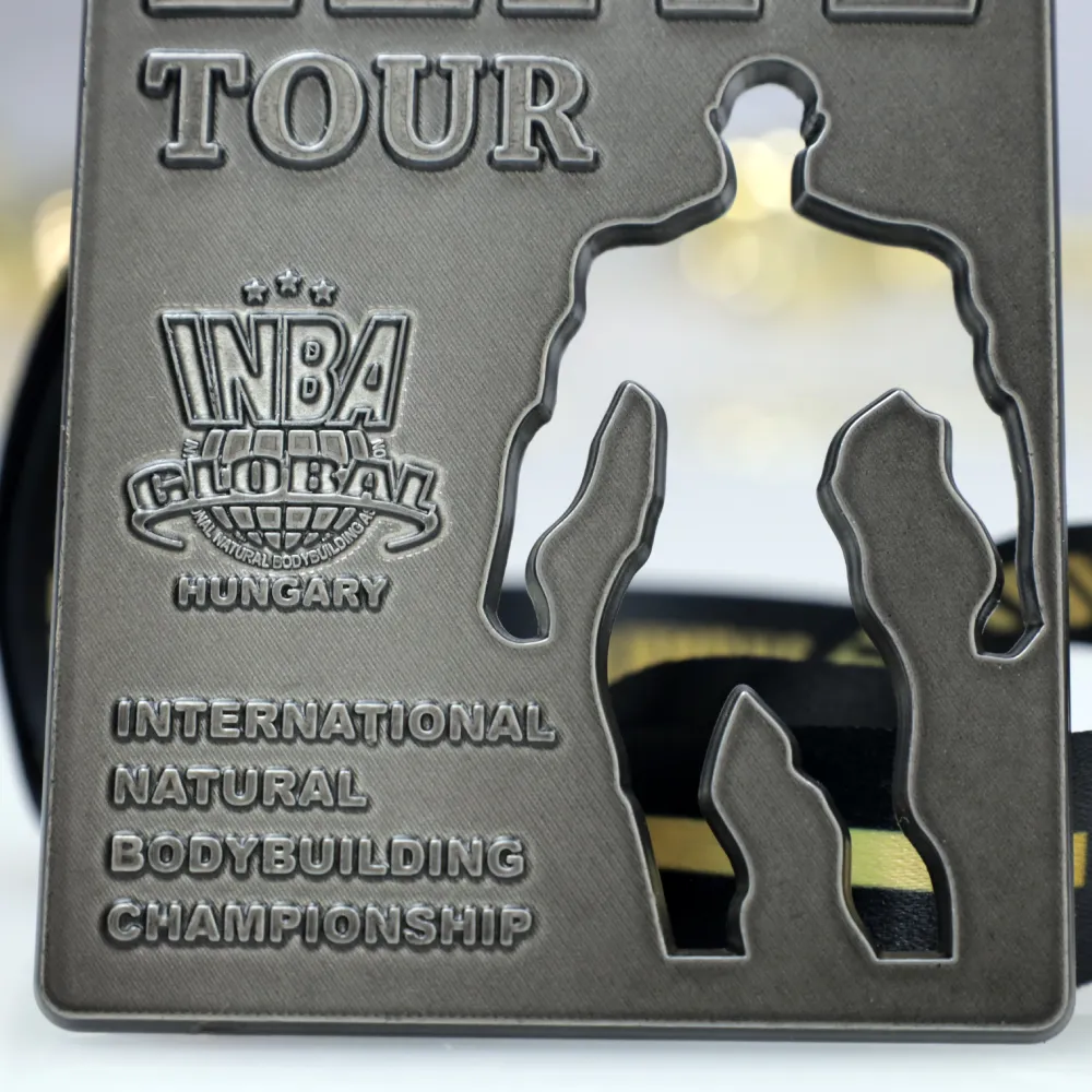 Diese Medaille wurde für die INBA Elite Tour in Ungarn verliehen, eine internationale Meisterschaft im natürlichen Bodybuilding. Das rechteckige Design mit ausgestanzter Silhouette eines Bodybuilders verleiht der Auszeichnung einen kraftvollen und markanten Look. Die Gravuren unterstreichen die professionelle Organisation und den globalen Charakter des Wettbewerbs.