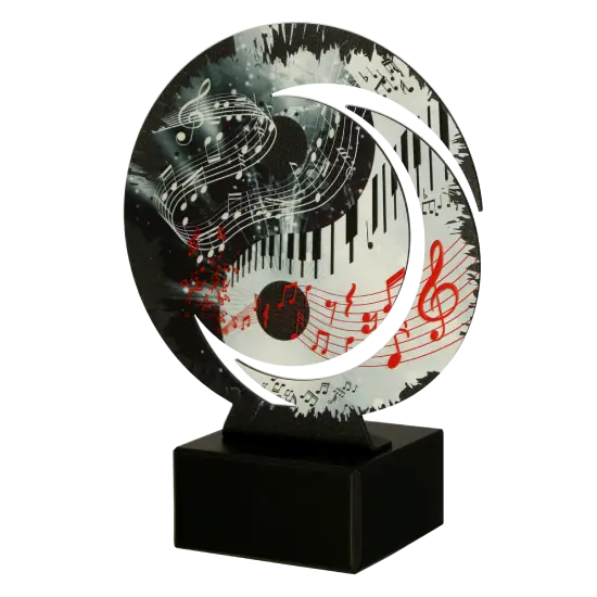 Kovová soška Hudební harmonie byla vytvořena s nejvyšší pečlivostí o detaily z odolného kovu o tloušťce 2 mm. Její tvar je laserově vyřezán. Černá barva jí dodává elegantní a moderní vzhled, který perfektně ladí s barevným UV potiskem. Tento potisk je odolný proti oděru, což zaručuje, že trofej bude potěšením po mnoho let.
