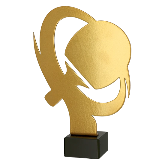 Kovová soška Pingpongová raketa je laserem vyřezána z kvalitního kovu o tloušťce 2 mm. Minimalistický tvar v kombinaci se zlatou barvou činí sošku moderní a stylovou. Celá je usazena na černém podstavci, na který můžete umístit personalizovanou gravírovanou destičku a dodat tak ceně jedinečný charakter.