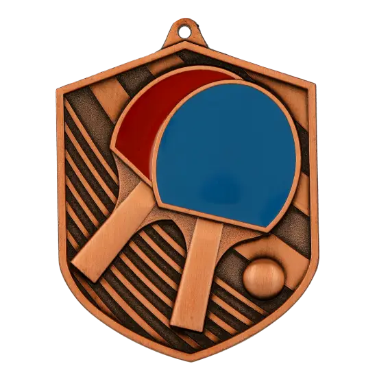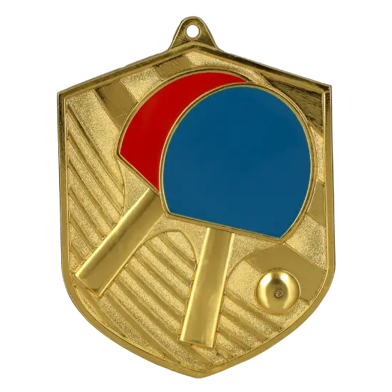 Medaile Pingpongová Pálka zaujme nejen svým tvarem, ale i pečlivým provedením. Její netradiční tvar připomíná erb, díky čemuž vyniká mezi klasickými kulatými sportovními medailemi. Na přední straně jsou zobrazeny dva pingpongové pálky – jedna modrá, druhá červená – spolu s klasickým míčkem na stolní tenis.