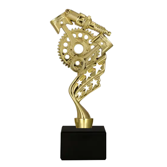 Plastová soška Motorismus je vyrobena z plastu a pokryta elegantním zlatým povrchem. Zobrazuje motoristické prvky, jako je píst motoru, zapalovací svíčka a ozubené kolo, které vyjadřují sílu a preciznost blízkou světu motorismu.