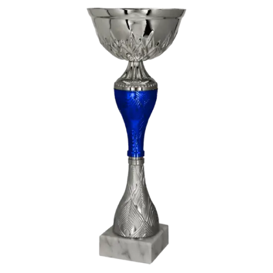 Stříbrný Pohár 9267 okouzluje pečlivostí provedení, od širokého kovového kalicha s jemným reliéfem až po vysokou nohu poháru, která působí velmi elegantně díky kombinaci dvou kontrastních barev: intenzivní modré a stříbrné. Celkový dojem doplňuje světlá mramorová základna s hladkou strukturou, jež stabilizuje konstrukci a podtrhuje luxusní charakter ocenění.