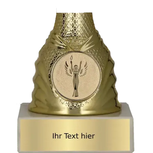 Pevná zlatá nožka poháru disponuje prostorem pro emblém – můžete zde umístit vlastní grafiku, logo nebo vybrat jeden z připravených motivů z naší nabídky. Celé ocenění stojí na světlé mramorové podstavě, která zajišťuje stabilitu a eleganci.