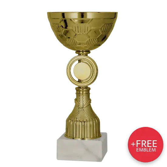 Zlatý Pohár 9291 zaujme svou konstrukcí. Velký metalický kalich ve zlaté barvě je zdoben geometrickými vzory připomínajícími plástve medu. Tato unikátní struktura dodává poháru moderní charakter. Bohatě zdobená stopka dále podtrhuje eleganci ocenění a vytváří harmonický a efektní celek. Pohár je umístěn na pevné, světlé mramorové základně, která nejen zajišťuje stabilitu, ale také poskytuje ideální plochu pro personalizaci.