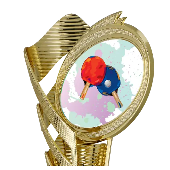 Pohár je vyroben z odolného plastu se zlatým povrchem, který efektně odráží světlo a přitahuje pozornost. Jeho štíhlá konstrukce vyzařuje moderní design. Na vrchu je umístěn kulatý disk s barevnou grafikou zobrazující dva stolní tenisové pálky a míček – typické symboly tohoto sportu.