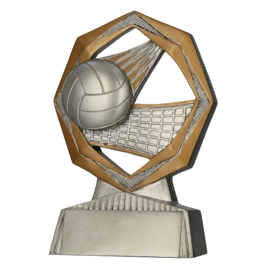 Za pozornost stojí originální motiv – letící volejbalový míč, za nímž se táhne dynamická stopa symbolizující rychlost, s jakou překonal síť. Celek je orámován elegantním zlatým osmiúhelníkovým rámem s jemnými stříbrnými prvky, které dodávají trofeji prestiž a moderní vzhled. Dvoubarevná povrchová úprava přitahuje pozornost a odlišuje tuto sošku od běžných volejbalových ocenění.